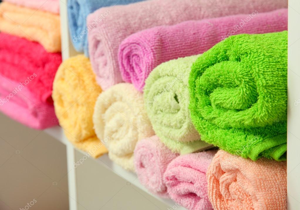 Colorful towels on shelves in bathroom