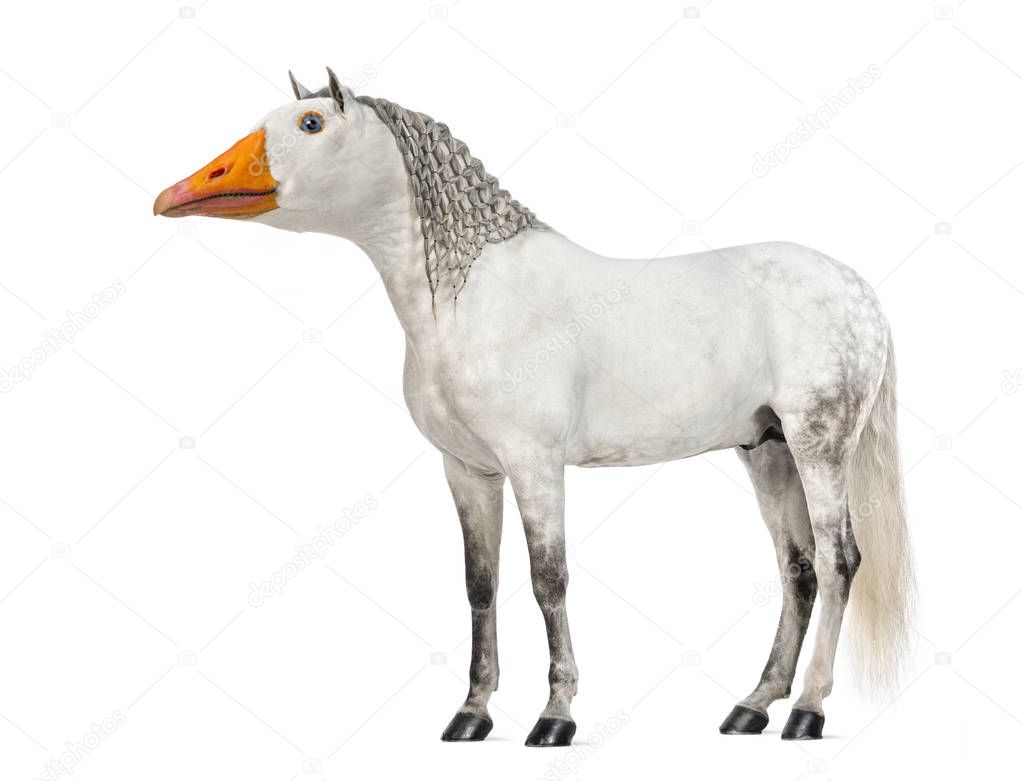 WHITE NOBODY HORIZONTAL PHOTOGRAPHY ISOLATED STUDIO PORTRAIT ANIMAL BIRD INDOORS MANE ALONE BIZARRE HUMOR STANDING HORSE BEAK PLAITS GOOSE BRAIDED HYBRID CHIMERA WHITE BACKGROUND COLOR IMAGE ONE ANIMAL SIDE VIEW LOOKING AT CAMERA ISOLATED ON WHITE STUDIO SHOT CUT OUT FULL LENGTH ANIMAL THEMES NO PEOPLE GENETIC MODIFICATION MALE ANIMAL DIGITAL COMPOSITE EQUUS FERUS CABALLUS ANDALUSIAN HORSE ANSER ANSER DOMESTICUS