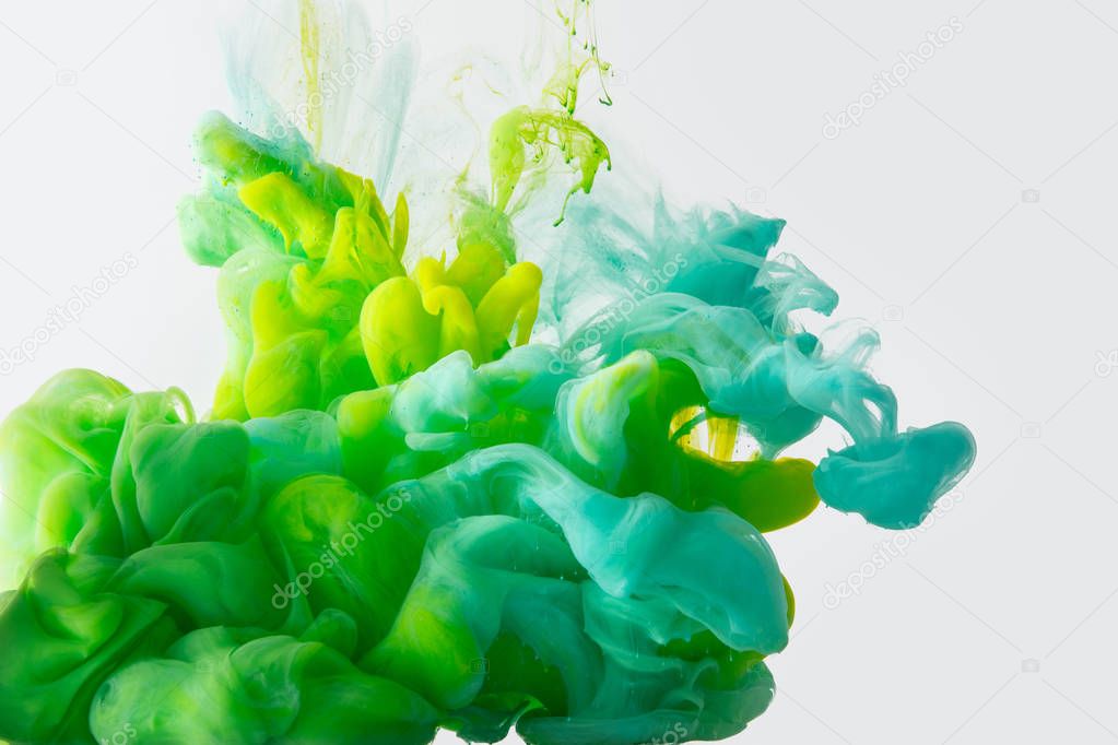 Close up view of mixing of green, yellow and bright turquoise paints splashes in water isolated on gray