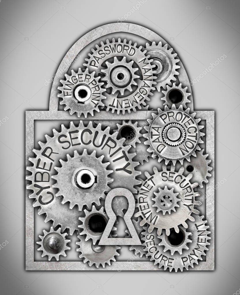 Photo of padlock and tooth wheel mechanism with CYBER SECURITY concept related words imprinted on metal surface