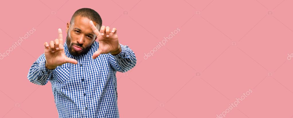 - African american man with beard confident and happy showing hands to camera, composing and framing gesture