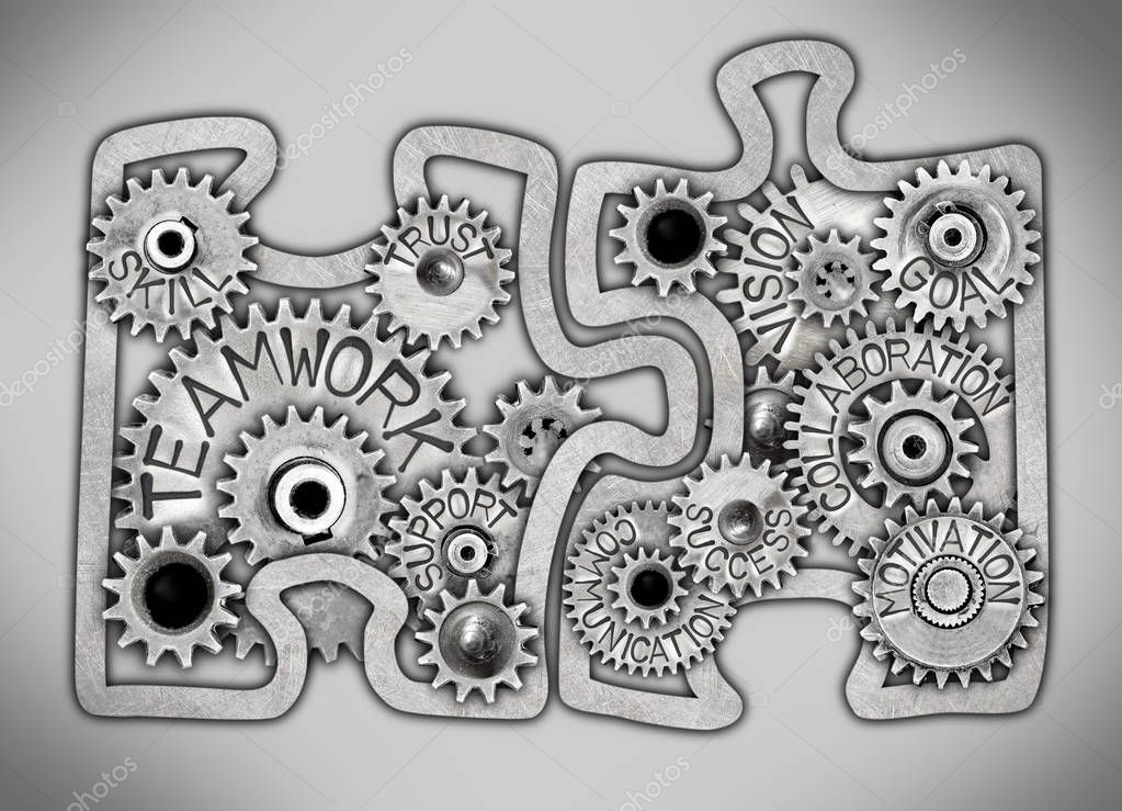 Puzzle and tooth wheel mechanism with TEAMWORK concept related words imprinted on metal surface