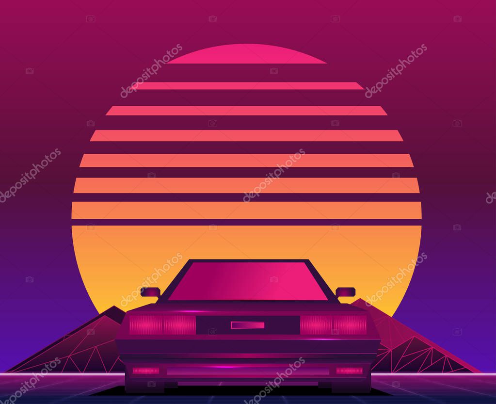 - Retro wave 80s style background with sunset and car
