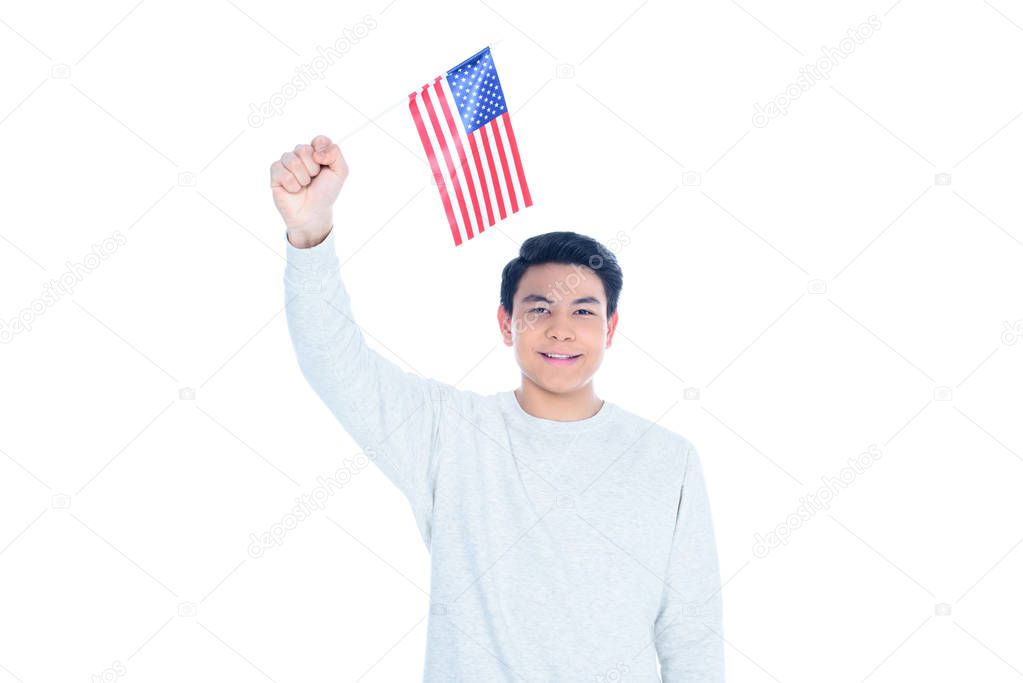 happy teen asian student boy with usa flag isolated on white