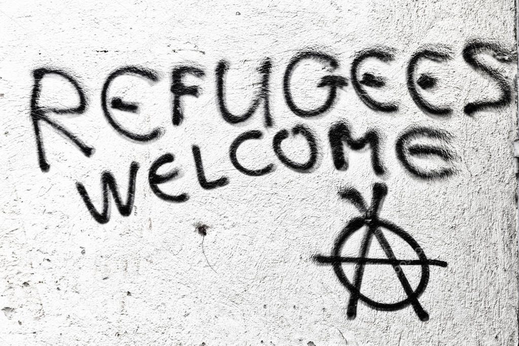 the spray paint in the wall with refugees welcome