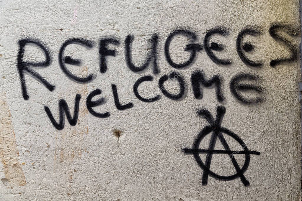 - the spray paint in the wall with refugees welcome