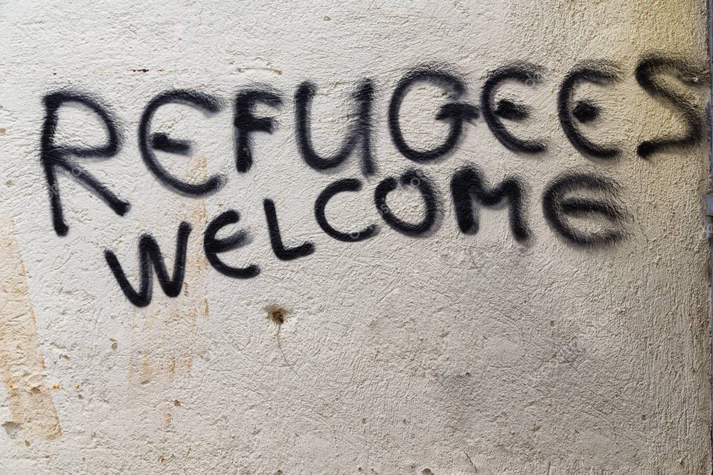 the spray paint in the wall with refugees welcome