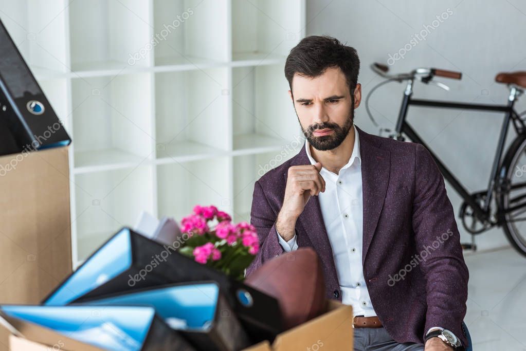 Fired young businessman sitting in office and looking at box of personal stuff