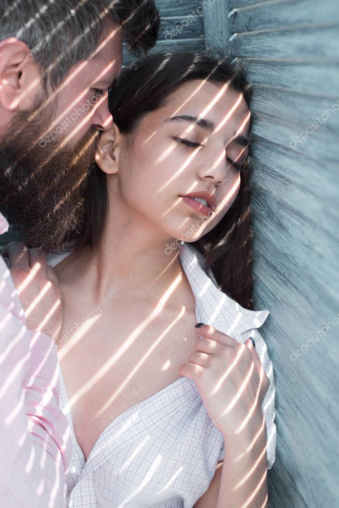 Bearded man caressing his girlfriend over wooden background. Couple in love hiding in shade on hot summer day. Newly weds on honeymoon, erotic games and foreplay concept.