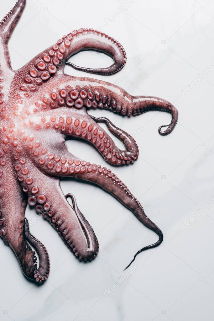 top view of raw octopus on light marble surface