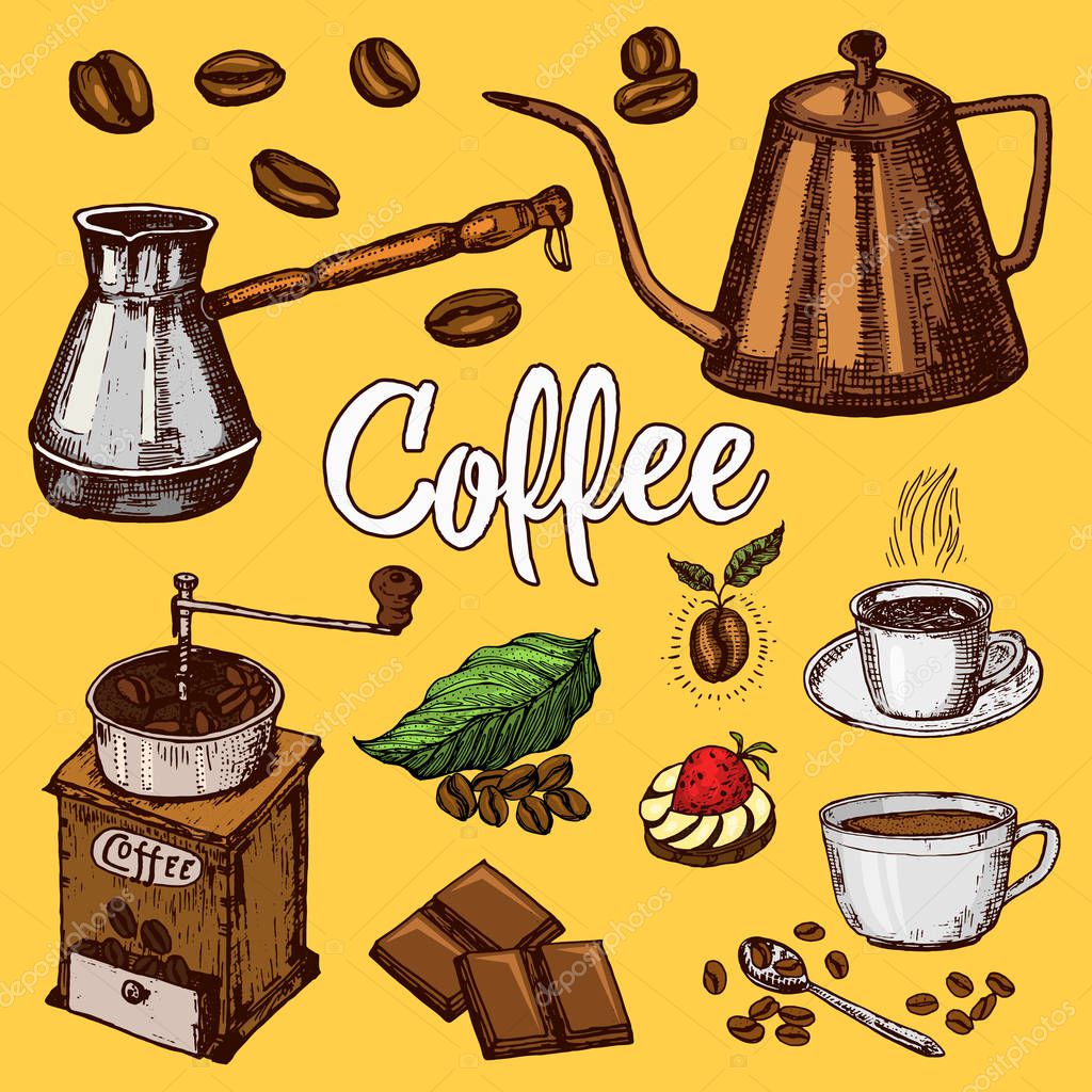 Traditional Filter Coffee Maker. Modern vintage elements, percolator, plants, grain and kettle for the shop menu. Vector illustration. engraved hand drawn in old sketch for card, badges, labels.