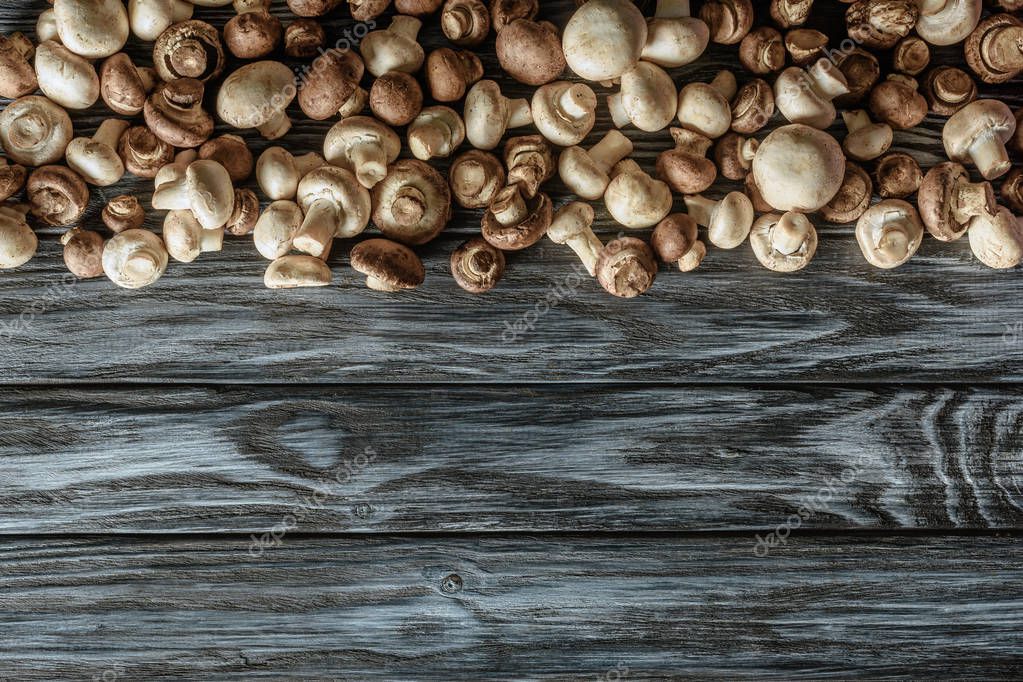 Top view of various raw champignon mushrooms on wooden surface