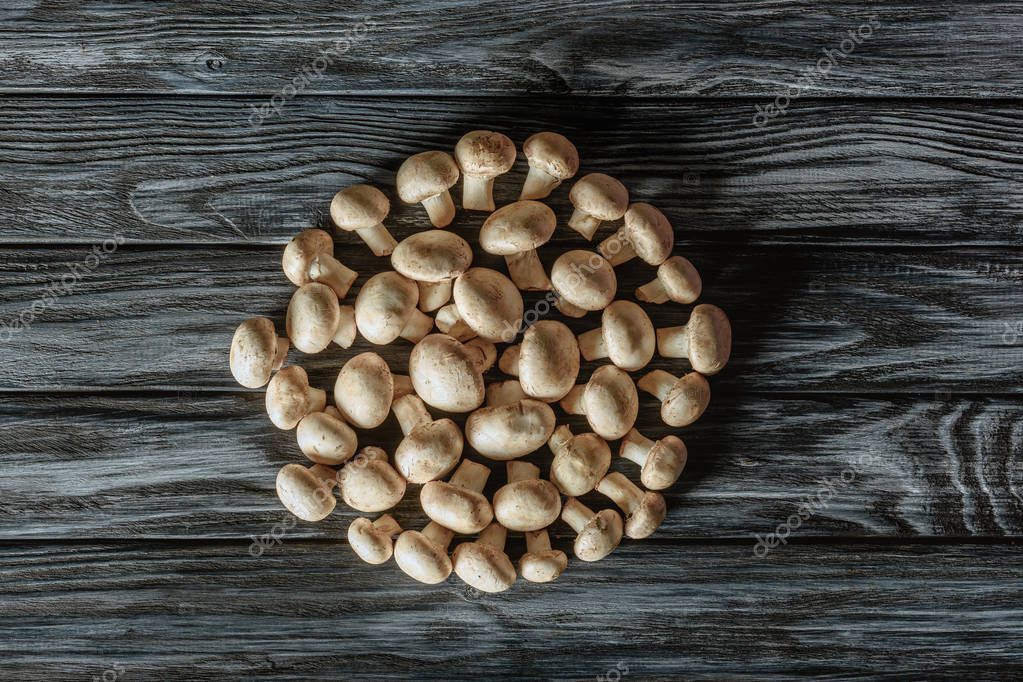 - top view of champignon mushrooms in circle shape on wooden surface
