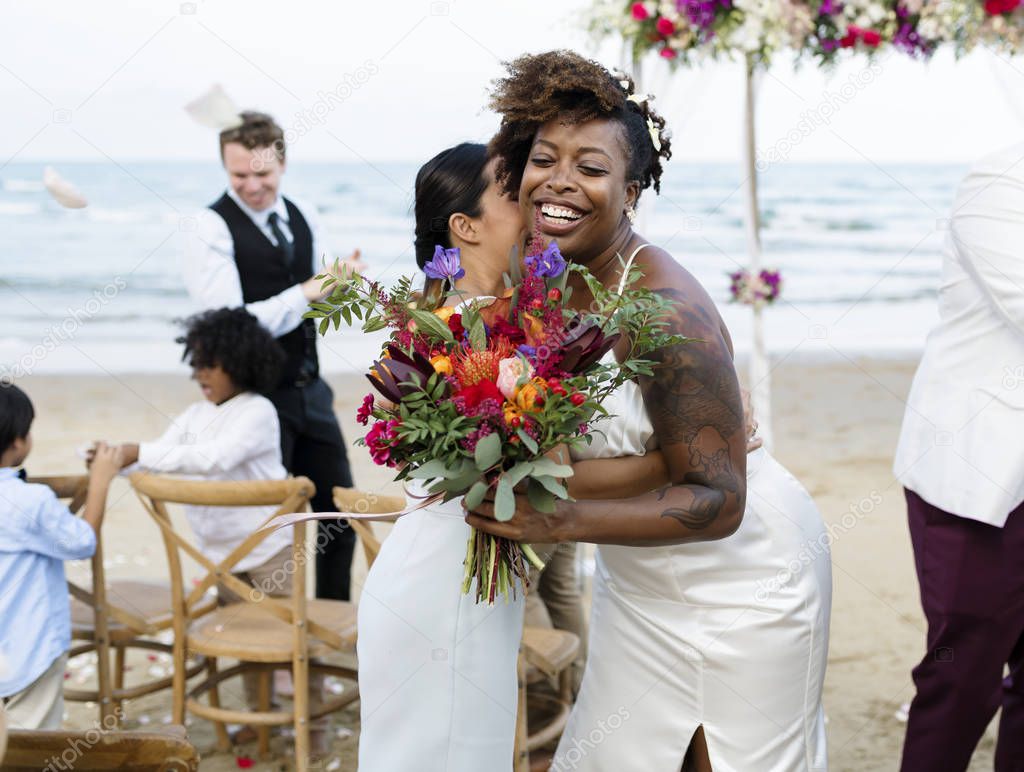 BRIDAL CELEBRATION DECORATION EVENT GREETING HAPPY LOVE PARTY SMILING SUMMER PEOPLE WOMEN HAPPINESS CHEERFUL OUTDOOR SMILE FLOWER BOYS FAMILY MAN SEA BLACK KIDS BOUQUET ROMANTIC WEDDING BRIDE TOGETHER FRIENDS CELEBRATING BEACH CONGRATULATIONS GROOM HUGGING SANDY ARRANGEMENT TATTOO MARRIAGE CEREMONY AFFECTION MARRY CONGRATS TATTOOED NEWLYWEDS GUESTS AFRICAN AMERICAN AFRICAN DESCENT PAGE BOY