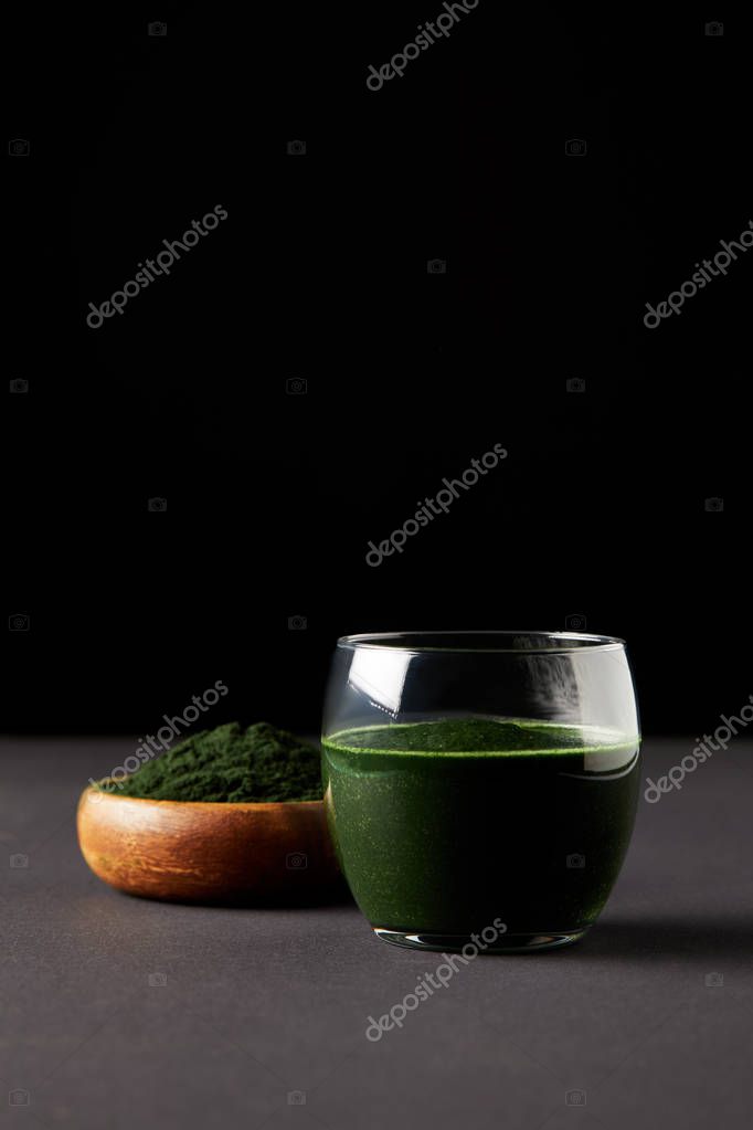fresh spirulina drink in glass and spirulina powder in wooden bowl on black background