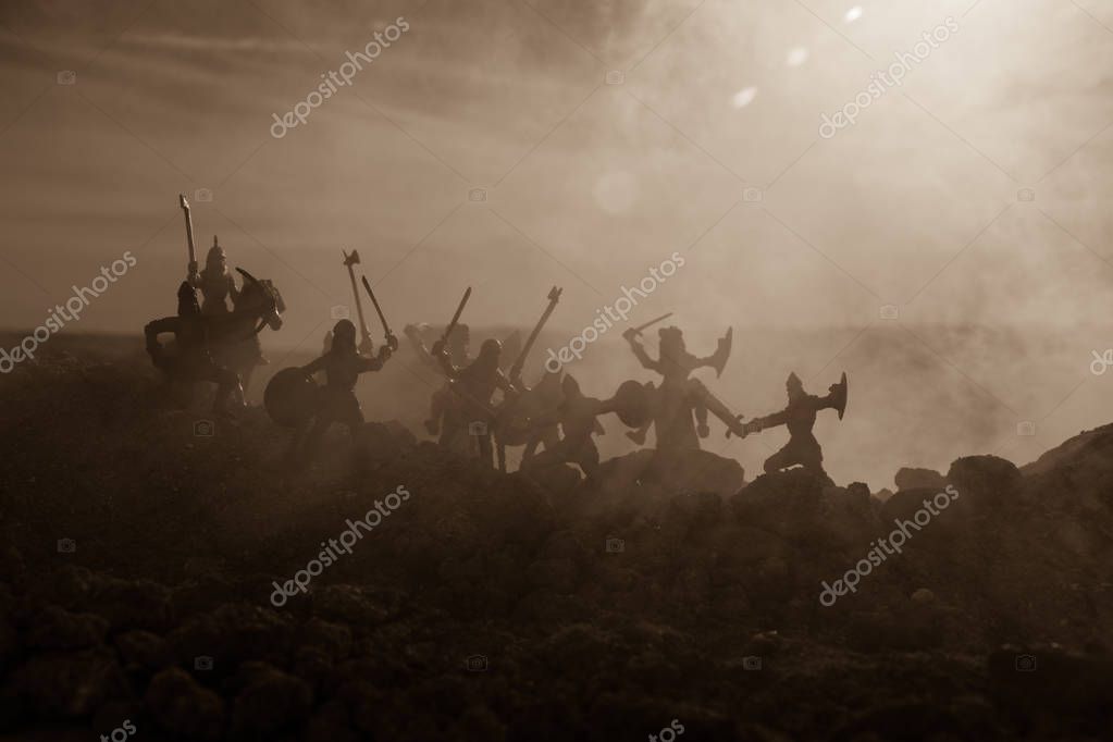 Medieval battle scene with cavalry and infantry. Silhouettes of figures as separate objects, fight between warriors on sunset foggy background. Selective focus