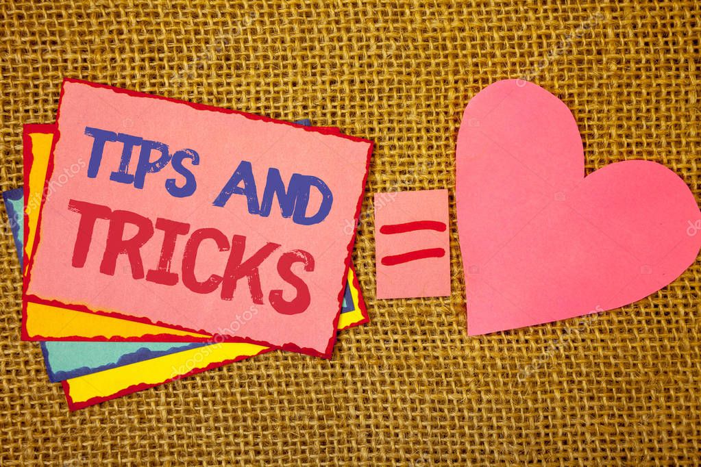 - Writing note showing Tips And Tricks. Business photo showcasing Suggestions to Make things easier Helpful Advices Solutions Pink yellow blue notes black red letters ideas equal sign heart wicker