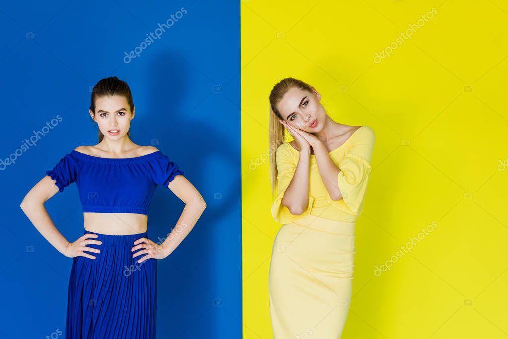 Attractive young girls in blue and yellow outfits posing on matching backgrounds
