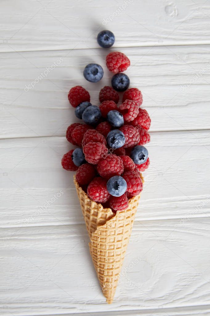 Top view of waffle cone with blueberries and raspberries on wooden table