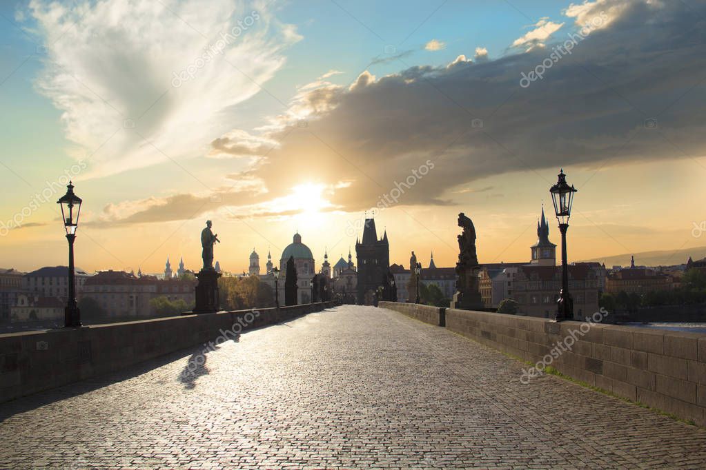 - Beautiful view of Old Town Tower of Charles Bridge at dawn in Prague, Czech Republic