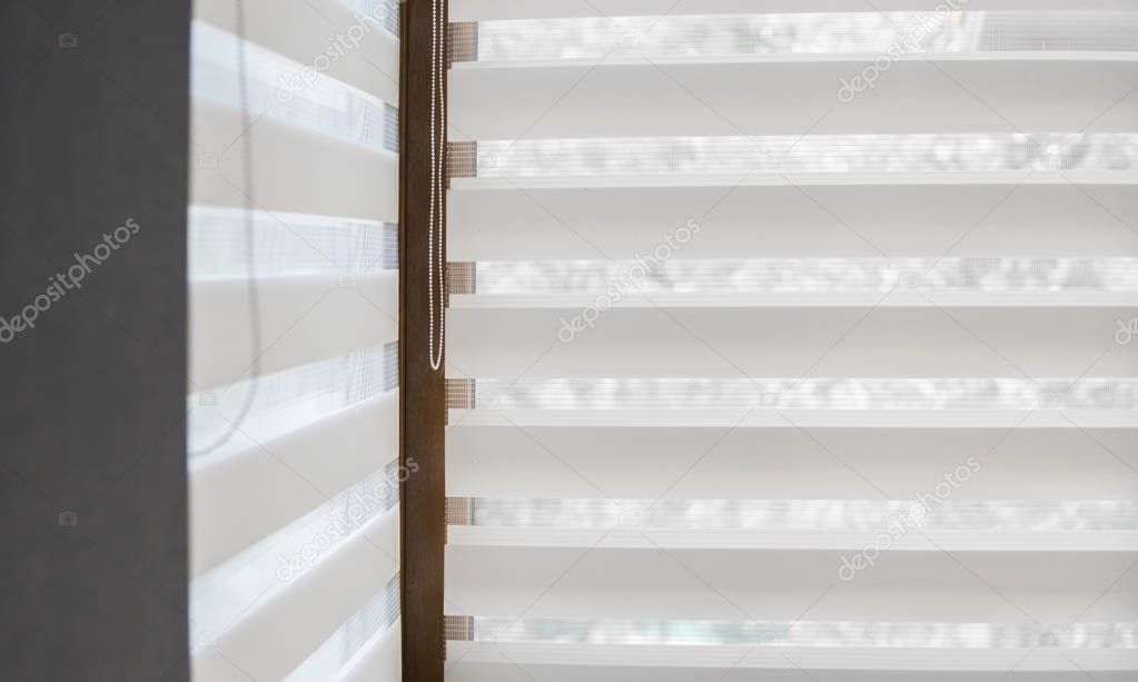 - Details of white fabric roller blinds on the plastic window with wood texture in the living room.