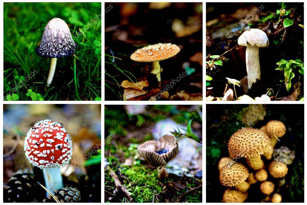 - Collection of Poisonous Mushrooms with Coprinus Comatus, Toadstool, Amanita, Fly Mushroom, Spider Mushroom on Blurred Natural background Outdoors