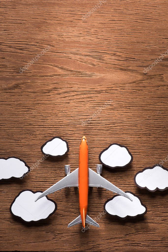 - top view of toy plane and paper clouds on wooden surface, traveling concept