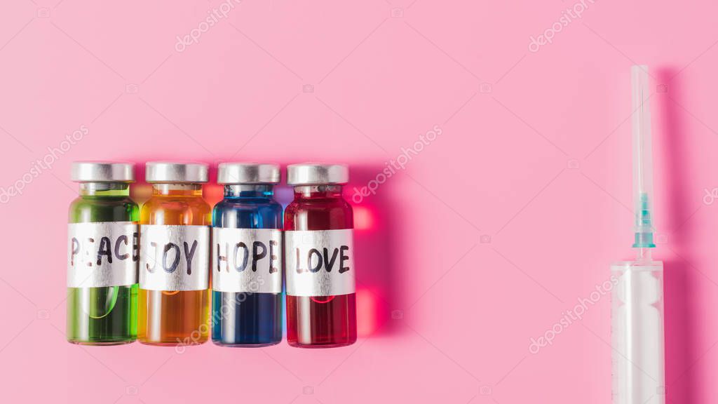 Top view of syringe and bottles with love, hope, joy and peace vaccine signs in row on pink tabletop