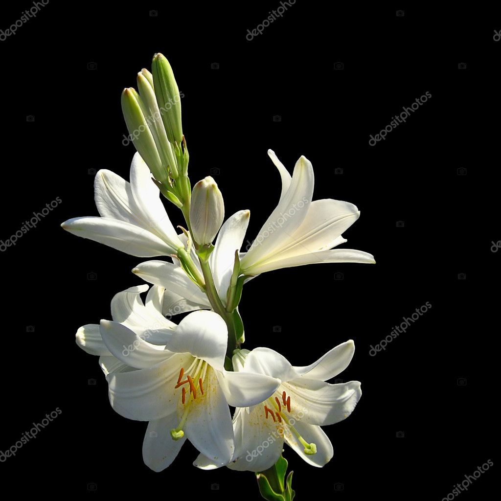 Easter lily flower closeup on black background. Lilium flower stem with several flowers.