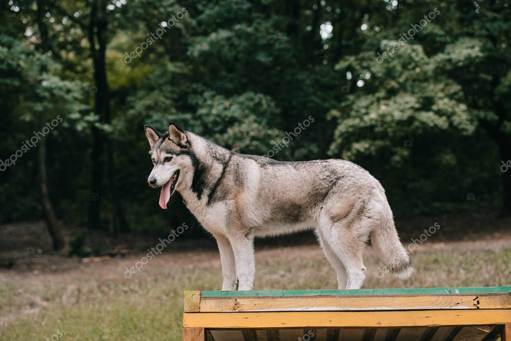 Grey husky dog on agility ground
