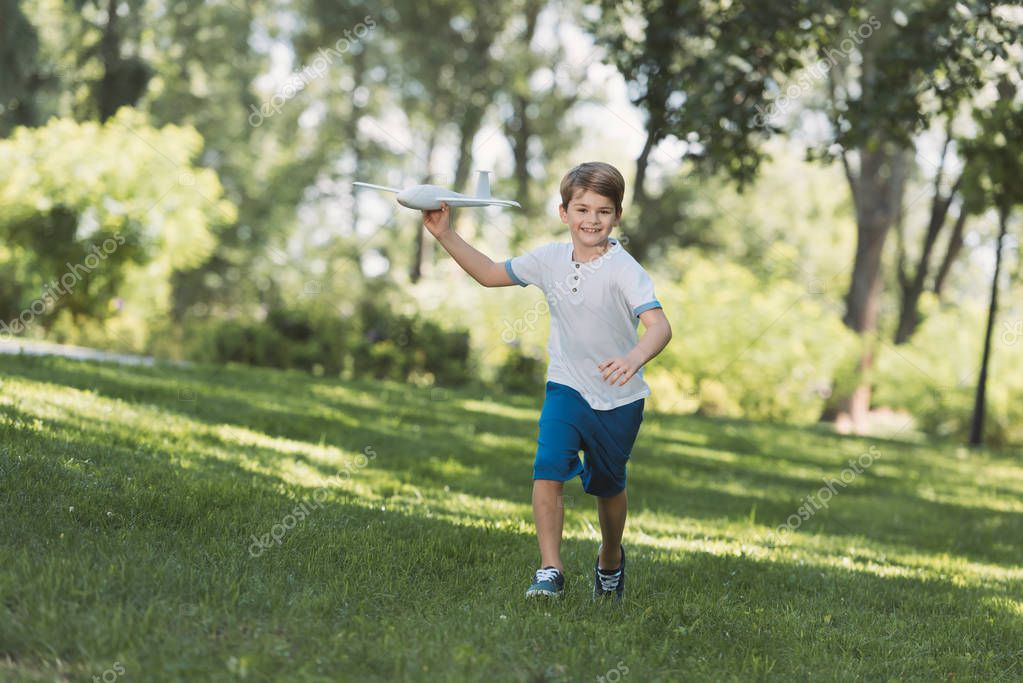 Adorable happy boy holding toy plane and smiling at camera in park