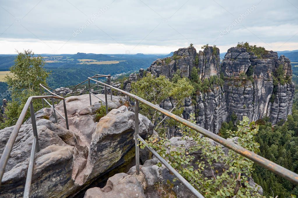 Railing on beautiful old rocks and forest on background in Bastei, Germany