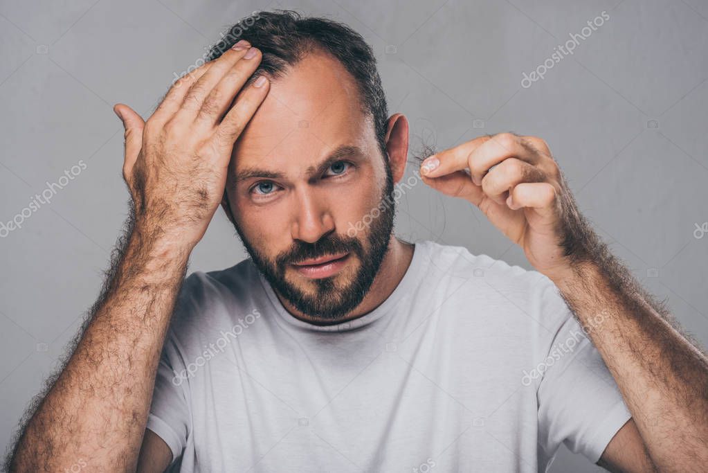 Bearded middle aged man holding fallen hair and looking at camera isolated on grey