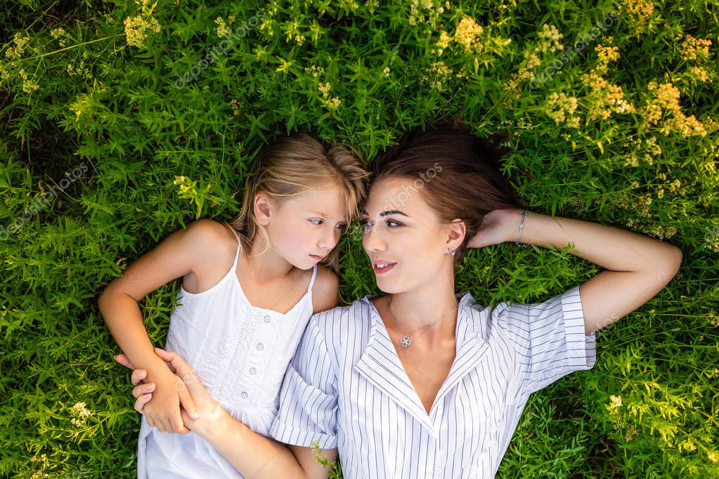 - top view of mother and daughter relaxing while lying in flowery meadow and looking at each other
