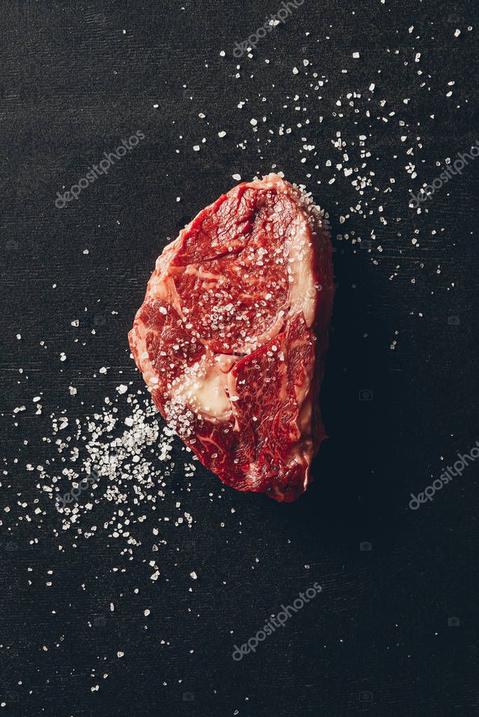 - top view of raw meat steak and salt on surface in kitchen