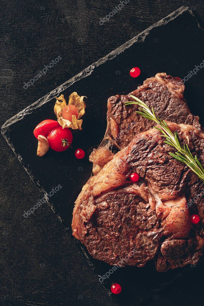 - elevated view of appetizing steaks with rosemary and berries on cutting boards in kitchen