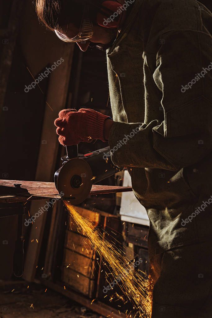 METAL PERSON ONE ADULT PEOPLE CAUCASIAN LIGHT STEEL MALE PROTECTION MAN INDUSTRIAL INDUSTRY WORKING WORK JOB INDOORS SAFETY PRODUCTION MANUFACTURING PROFESSION ALONE UNIFORM WORKSHOP WORKER MANUFACTURE FACTORY WORKWEAR CONCENTRATED FOCUSED SPARKS CRAFTSMAN LABOR WELDER PROFESSIONAL OCCUPATION COPY SPACE CIRCULAR SAW BLUE COLLAR BUZZ SAW PROTECTIVE GOGGLES PROCESSING INDUSTRY