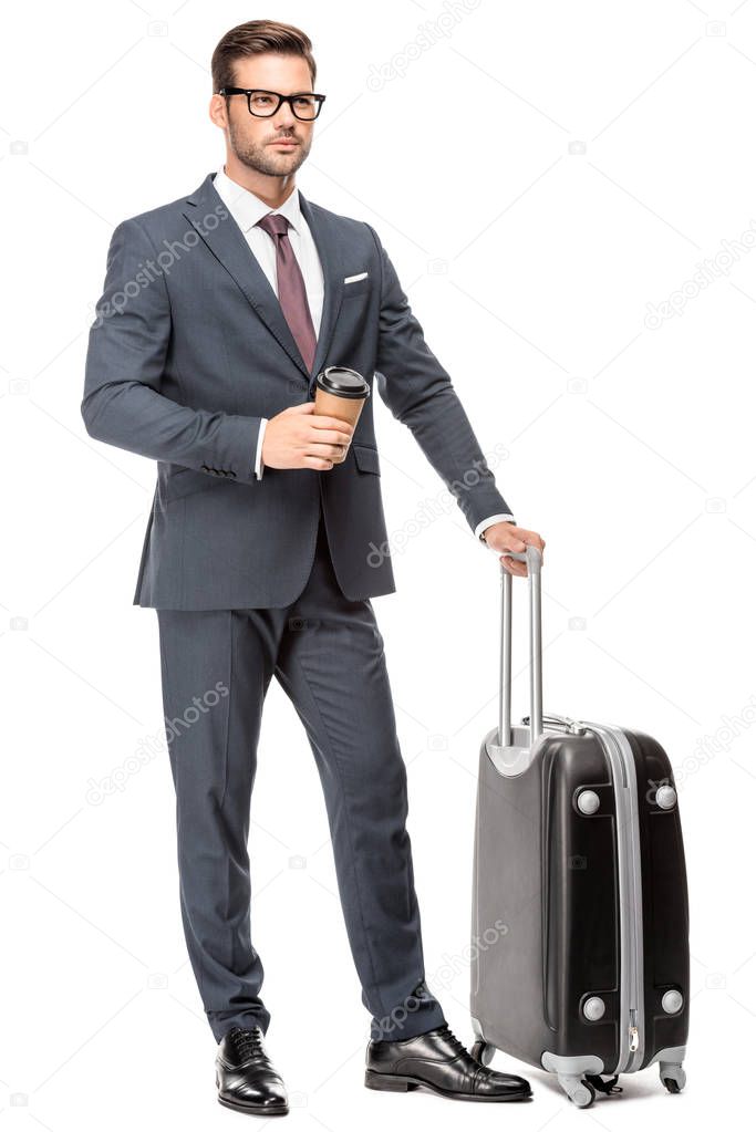 - handsome young businessman with luggage and paper cup of coffee looking away isolated on white