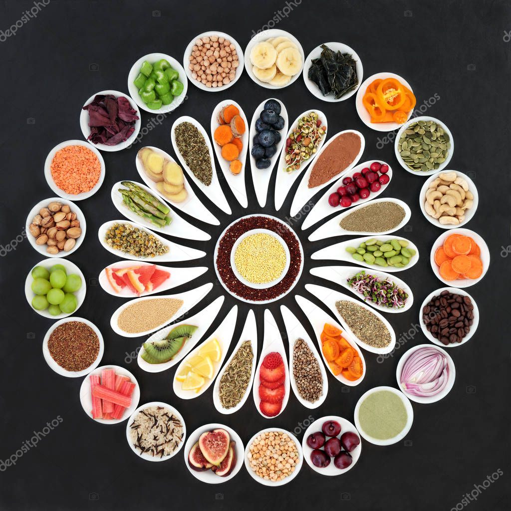 - Large diet health food selection for weight loss on slate including vegetables, grains, nuts, seeds, supplement powders, spices and herbs used in herbal medicine to help with dieting and suppressing appetite.