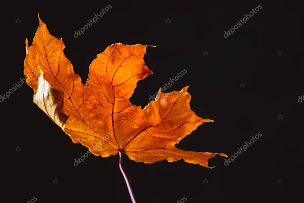 - beautiful orange maple leaf isolated on black, autumn background