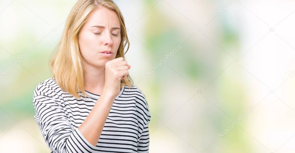 Beautiful young woman wearing stripes sweater over isolated background feeling unwell and coughing as symptom for cold or bronchitis. Healthcare concept.