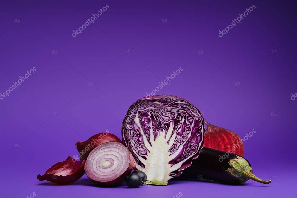 Sliced cabbage, onions, grapes, beetroot and eggplant on purple