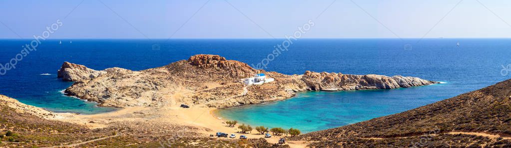 - Panoramic view of Agios Sostis beach, one of the most beautiful beaches of Serifos. Cyclades, Greece
