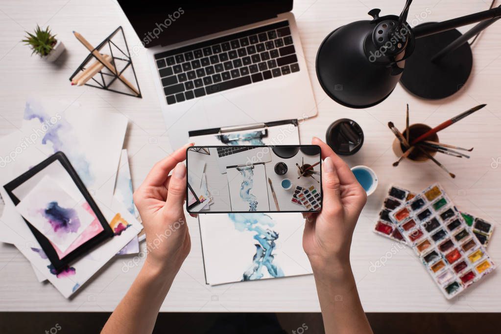 - office desk with laptop, art supplies and cropped view of designer taking picture with smartphone, flat lay