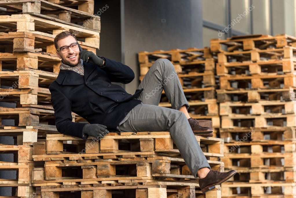 - handsome smiling man talking on smartphone and laying on wooden pallets