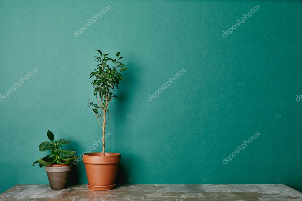 - Two plants in flowerpots on green background