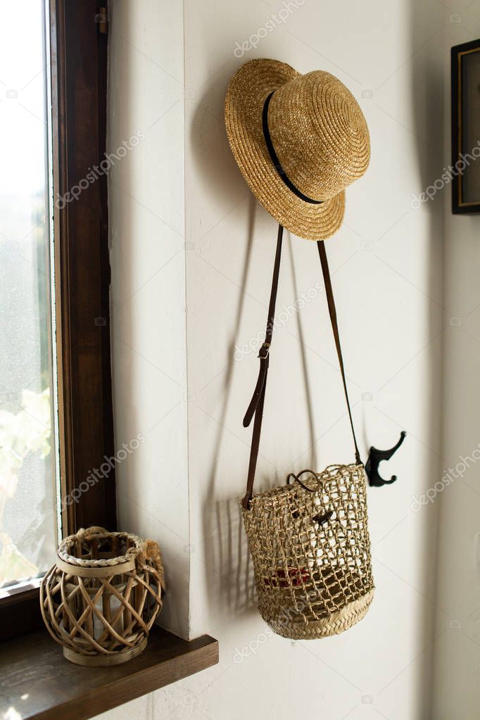 - wicker hat and bag hang on a white wall in the hallway at home