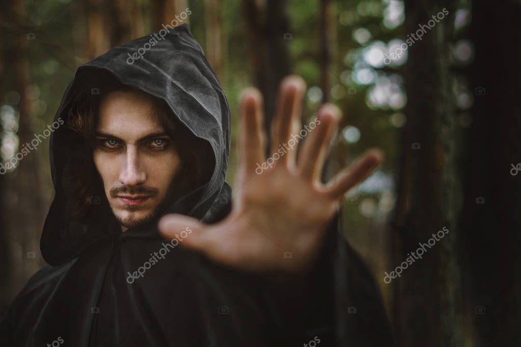 The black monk pointing his finger in the woods