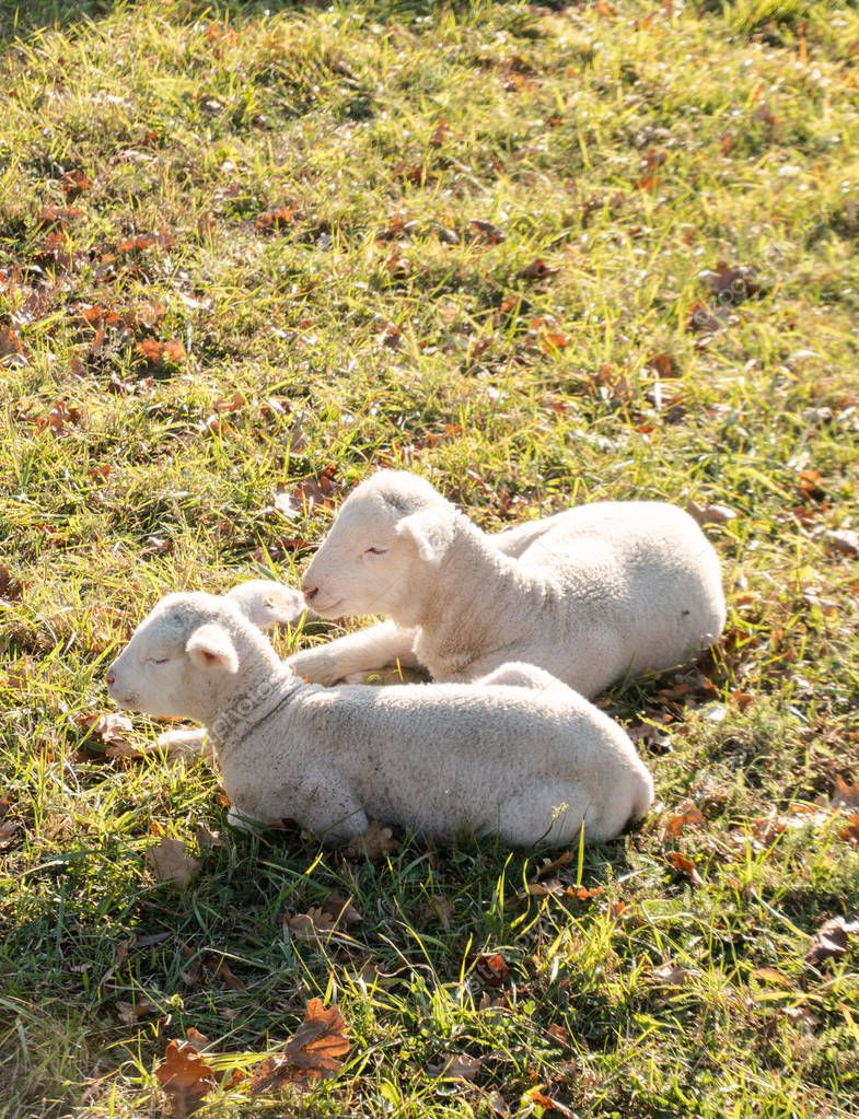 two young white lambs cuddling and laying next to each other on a grassy field in the warm sunshine