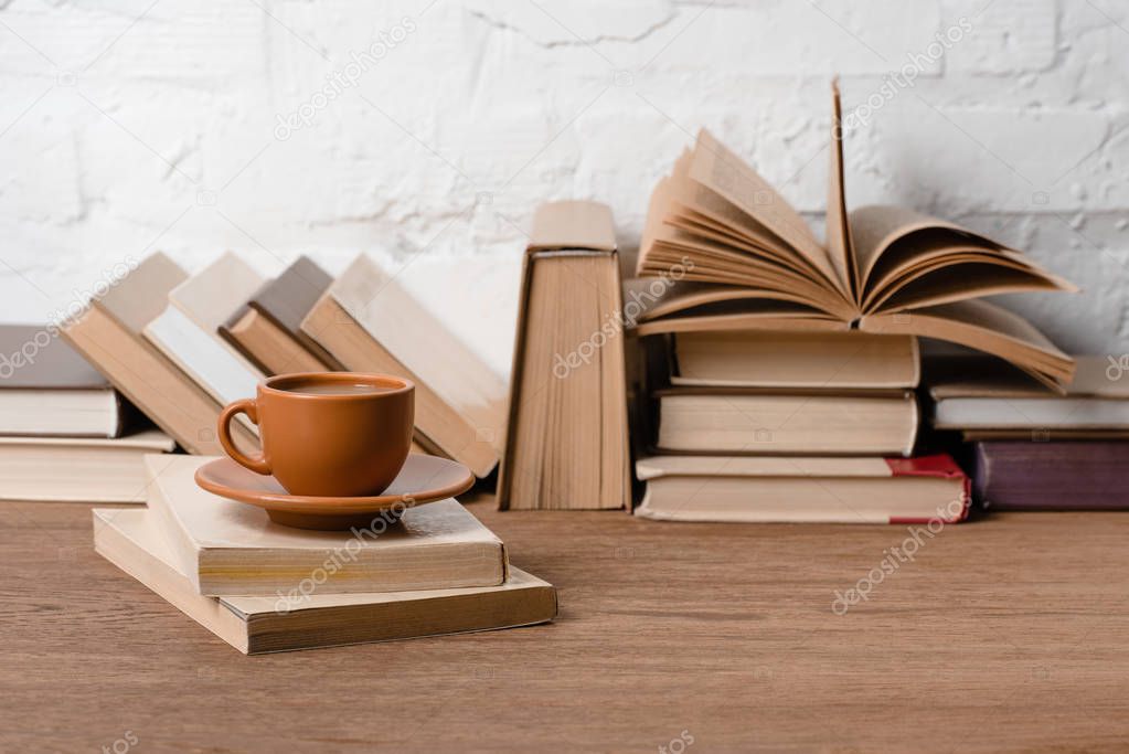 books and cup of coffee on wooden table